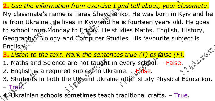 2. Use the information from exercise I and tell about, your classmate. My classmate’s name is Taras Shevchenko. He was born in Kyiv and he is from Ukraine. He lives in Kyiv and he is fourteen years old. He goes to school from Monday to Friday. He studies Maths, English, History, Geography, Biology and Computer Studies. His favourite subject is English. 3. Listen to the text. Mark the sentences true (T) or false (F). 1. Maths and Science are not taught in every school. – False. 2. English is a required subject in Ukraine. – False. 3. Students in both the UK and Ukraine often study Physical Education. – True. 4. Ukrainian schools sometimes teach traditional crafts. – True.