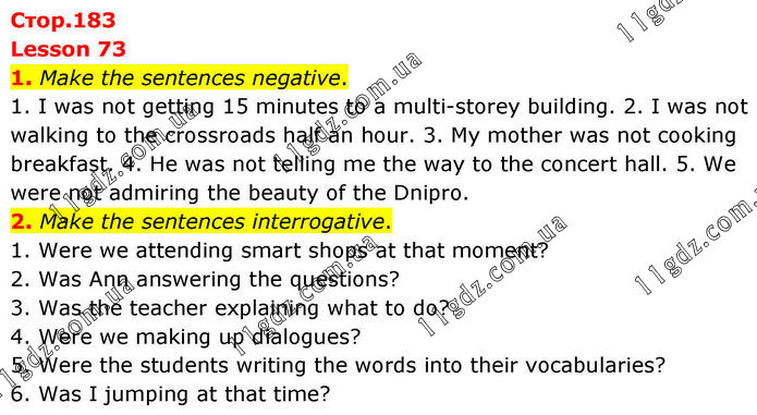 Lesson 73 1. Make the sentences negative. 1. I was not getting 15 minutes to a multi-storey building. 2. I was not walking to the crossroads half an hour. 3. My mother was not cooking breakfast. 4. He was not telling me the way to the concert hall. 5. We were not admiring the beauty of the Dnipro. 2. Make the sentences interrogative. 1. Were we attending smart shops at that moment? 2. Was Ann answering the questions? 3. Was the teacher explaining what to do? 4. Were we making up dialogues? 5. Were the students writing the words into their vocabularies? 6. Was I jumping at that time?