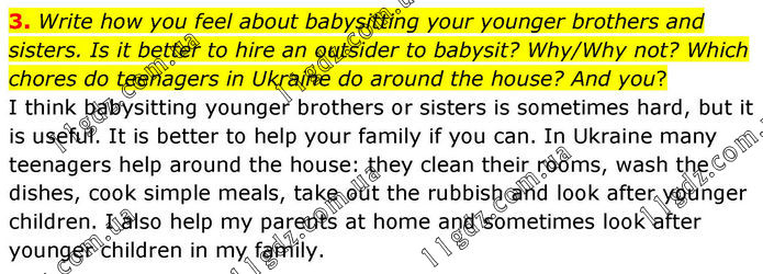 3. Write how you feel about babysitting your younger brothers and sisters. Is it better to hire an outsider to babysit? Why/Why not? Which chores do teenagers in Ukraine do around the house? And you? I think babysitting younger brothers or sisters is sometimes hard, but it is useful. It is better to help your family if you can. In Ukraine many teenagers help around the house: they clean their rooms, wash the dishes, cook simple meals, take out the rubbish and look after younger children. I also help my parents at home and sometimes look after younger children in my family.