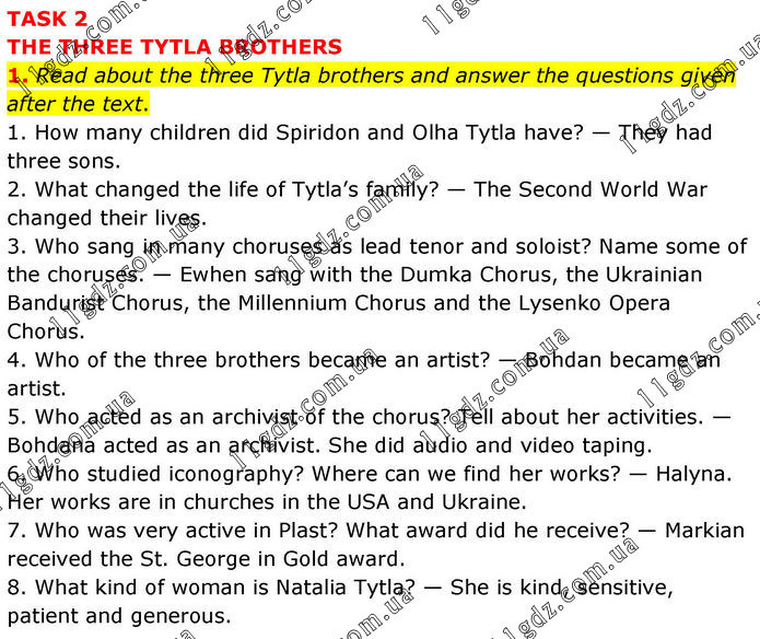 TASK 2 THE THREE TYTLA BROTHERS 1. Read about the three Tytla brothers and answer the questions given after the text. 1. How many children did Spiridon and Olha Tytla have? — They had three sons. 2. What changed the life of Tytla’s family? — The Second World War changed their lives. 3. Who sang in many choruses as lead tenor and soloist? Name some of the choruses. — Ewhen sang with the Dumka Chorus, the Ukrainian Bandurist Chorus, the Millennium Chorus and the Lysenko Opera Chorus. 4. Who of the three brothers became an artist? — Bohdan became an artist. 5. Who acted as an archivist of the chorus? Tell about her activities. — Bohdana acted as an archivist. She did audio and video taping. 6. Who studied iconography? Where can we find her works? — Halyna. Her works are in churches in the USA and Ukraine. 7. Who was very active in Plast? What award did he receive? — Markian received the St. George in Gold award. 8. What kind of woman is Natalia Tytla? — She is kind, sensitive, patient and generous.