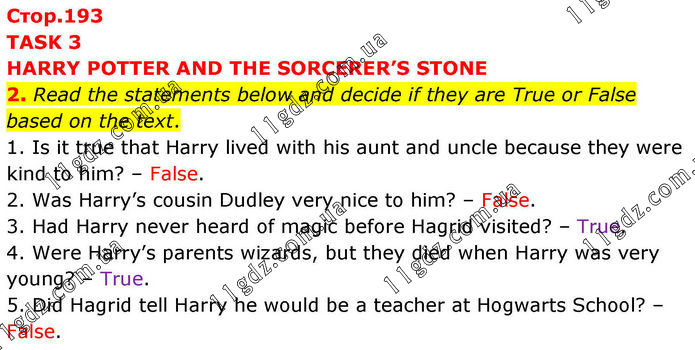 TASK 3 HARRY POTTER AND THE SORCERER’S STONE 2. Read the statements below and decide if they are True or False based on the text. 1. Is it true that Harry lived with his aunt and uncle because they were kind to him? – False. 2. Was Harry’s cousin Dudley very nice to him? – False. 3. Had Harry never heard of magic before Hagrid visited? – True. 4. Were Harry’s parents wizards, but they died when Harry was very young? – True. 5. Did Hagrid tell Harry he would be a teacher at Hogwarts School? – False.
