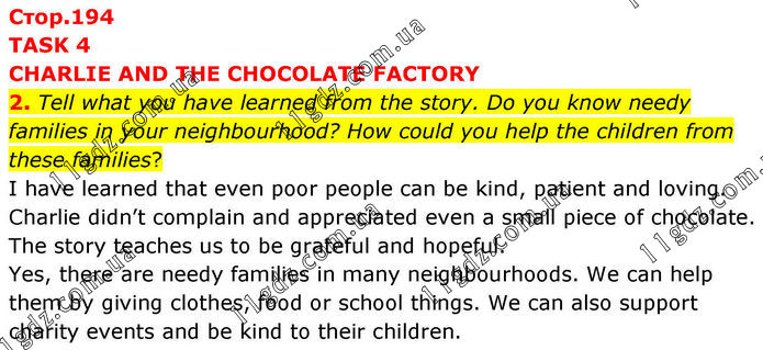TASK 4 CHARLIE AND THE CHOCOLATE FACTORY 2. Tell what you have learned from the story. Do you know needy families in your neighbourhood? How could you help the children from these families? I have learned that even poor people can be kind, patient and loving. Charlie didn’t complain and appreciated even a small piece of chocolate. The story teaches us to be grateful and hopeful. Yes, there are needy families in many neighbourhoods. We can help them by giving clothes, food or school things. We can also support charity events and be kind to their children.
