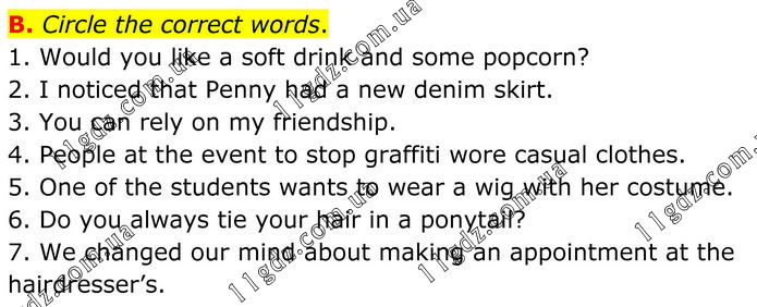 B. Circle the correct words. 1. Would you like a soft drink and some popcorn? 2. I noticed that Penny had a new denim skirt. 3. You can rely on my friendship. 4. People at the event to stop graffiti wore casual clothes. 5. One of the students wants to wear a wig with her costume. 6. Do you always tie your hair in a ponytail? 7. We changed our mind about making an appointment at the hairdresser’s.