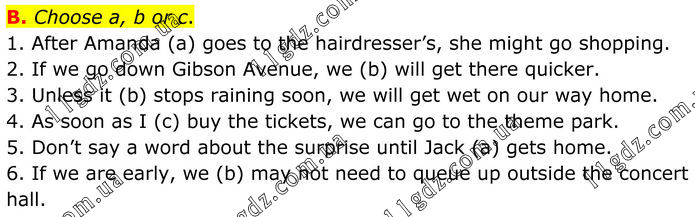 B. Choose a, b or c. 1. After Amanda (a) goes to the hairdresser’s, she might go shopping. 2. If we go down Gibson Avenue, we (b) will get there quicker. 3. Unless it (b) stops raining soon, we will get wet on our way home. 4. As soon as I (c) buy the tickets, we can go to the theme park. 5. Don’t say a word about the surprise until Jack (a) gets home. 6. If we are early, we (b) may not need to queue up outside the concert hall.
