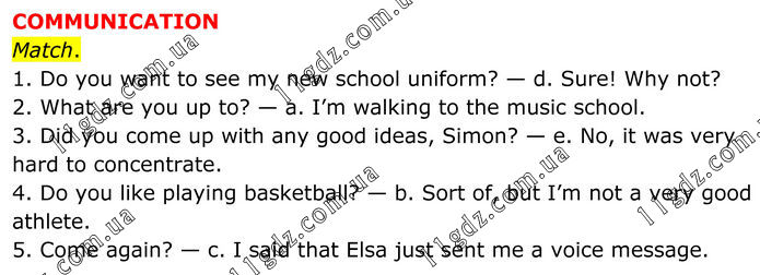 COMMUNICATION Match. 1. Do you want to see my new school uniform? — d. Sure! Why not? 2. What are you up to? — a. I’m walking to the music school. 3. Did you come up with any good ideas, Simon? — e. No, it was very hard to concentrate. 4. Do you like playing basketball? — b. Sort of, but I’m not a very good athlete. 5. Come again? — c. I said that Elsa just sent me a voice message.