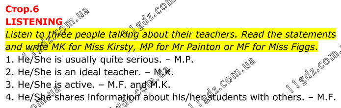 LISTENING Listen to three people talking about their teachers. Read the statements and write MK for Miss Kirsty, MP for Mr Painton or MF for Miss Figgs. 1. He/She is usually quite serious. – M.P. 2. He/She is an ideal teacher. – M.K. 3. He/She is active. – M.F. and M.K. 4. He/She shares information about his/her students with others. – M.F.