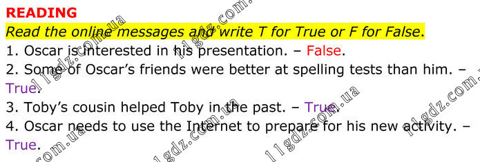 READING Read the online messages and write T for True or F for False. 1. Oscar is interested in his presentation. – False. 2. Some of Oscar’s friends were better at spelling tests than him. – True. 3. Toby’s cousin helped Toby in the past. – True. 4. Oscar needs to use the Internet to prepare for his new activity. – True.