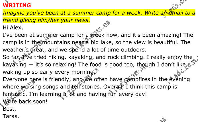 WRITING Imagine you’ve been at a summer camp for a week. Write an email to a friend giving him/her your news. Hi Alex, I’ve been at summer camp for a week now, and it’s been amazing! The camp is in the mountains near a big lake, so the view is beautiful. The weather’s great, and we spend a lot of time outdoors. So far, I’ve tried hiking, kayaking, and rock climbing. I really enjoy the kayaking — it’s so relaxing! The food is good too, though I don’t like waking up so early every morning. Everyone here is friendly, and we often have campfires in the evening where we sing songs and tell stories. Overall, I think this camp is fantastic. I’m learning a lot and having fun every day! Write back soon! Best, Taras.