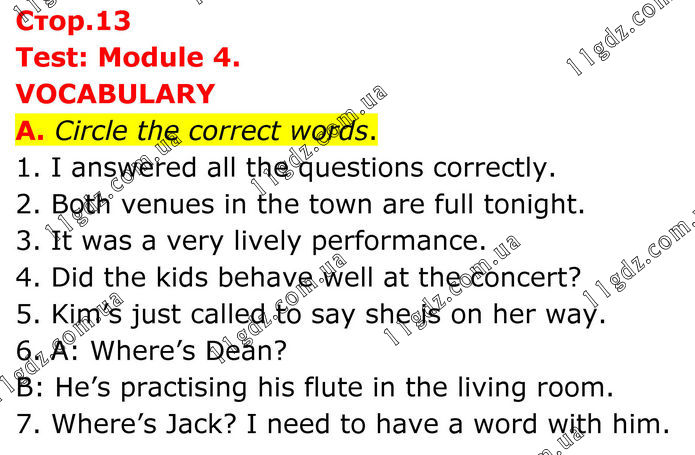 Test: Module 4. VOCABULARY A. Circle the correct words. 1. I answered all the questions correctly. 2. Both venues in the town are full tonight. 3. It was a very lively performance. 4. Did the kids behave well at the concert? 5. Kim’s just called to say she is on her way. 6. A: Where’s Dean? B: He’s practising his flute in the living room. 7. Where’s Jack? I need to have a word with him.