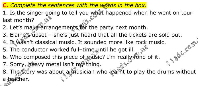 C. Complete the sentences with the words in the box. 1. Is the singer going to tell you what happened when he went on tour last month? 2. Let’s make arrangements for the party next month. 3. Elaine’s upset – she’s just heard that all the tickets are sold out. 4. It wasn’t classical music. It sounded more like rock music. 5. The conductor worked full–time until he got ill. 6. Who composed this piece of music? I’m really fond of it. 7. Sorry, heavy metal isn’t my thing. 8. The story was about a musician who learnt to play the drums without a teacher.