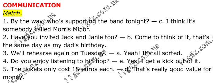COMMUNICATION Match. 1. By the way, who’s supporting the band tonight? — c. I think it’s somebody called Morris Minor. 2. Have you invited Jack and Janie too? — b. Come to think of it, that’s the same day as my dad’s birthday. 3. We’ll rehearse again on Tuesday. — a. Yeah! It’s all sorted. 4. Do you enjoy listening to hip hop? — e. Yes, I get a kick out of it. 5. The tickets only cost 15 euros each. — d. That’s really good value for money.