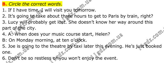 B. Circle the correct words. 1. If I have time, I will visit you tomorrow. 2. It’s going to take about three hours to get to Paris by train, right? 3. Lucy will probably get lost. She doesn’t know her way around this part of the city. 4. A: When does your music course start, Helen? B: On Monday morning, at ten o’clock. 5. Joe is going to the theatre by taxi later this evening. He’s just booked one. 6. Don’t be so restless or you won’t enjoy the event.