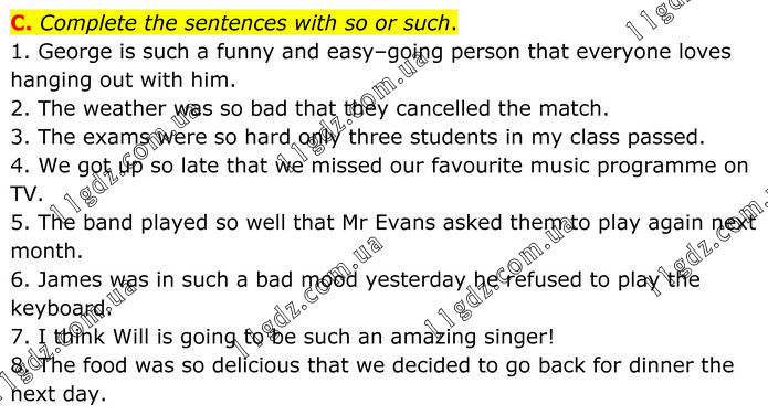 C. Complete the sentences with so or such. 1. George is such a funny and easy–going person that everyone loves hanging out with him. 2. The weather was so bad that they cancelled the match. 3. The exams were so hard only three students in my class passed. 4. We got up so late that we missed our favourite music programme on TV. 5. The band played so well that Mr Evans asked them to play again next month. 6. James was in such a bad mood yesterday he refused to play the keyboard. 7. I think Will is going to be such an amazing singer! 8. The food was so delicious that we decided to go back for dinner the next day.