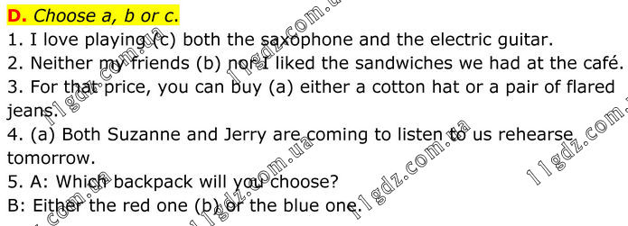 D. Choose a, b or c. 1. I love playing (c) both the saxophone and the electric guitar. 2. Neither my friends (b) nor I liked the sandwiches we had at the café. 3. For that price, you can buy (a) either a cotton hat or a pair of flared jeans. 4. (a) Both Suzanne and Jerry are coming to listen to us rehearse tomorrow. 5. A: Which backpack will you choose? B: Either the red one (b) or the blue one.