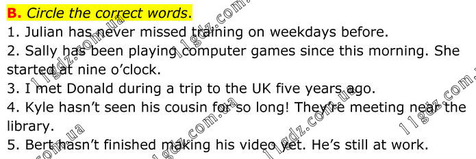 B. Circle the correct words. 1. Julian has never missed training on weekdays before. 2. Sally has been playing computer games since this morning. She started at nine o’clock. 3. I met Donald during a trip to the UK five years ago. 4. Kyle hasn’t seen his cousin for so long! They’re meeting near the library. 5. Bert hasn’t finished making his video yet. He’s still at work.