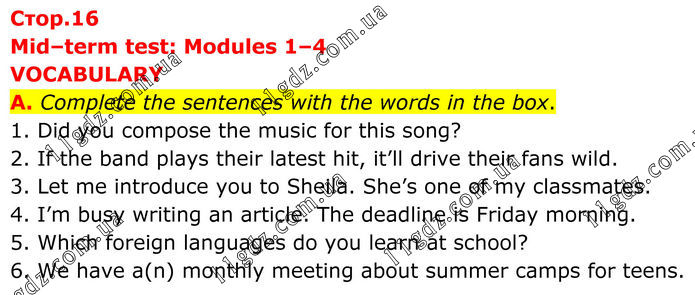 Mid–term test: Modules 1–4 VOCABULARY A. Complete the sentences with the words in the box. 1. Did you compose the music for this song? 2. If the band plays their latest hit, it’ll drive their fans wild. 3. Let me introduce you to Sheila. She’s one of my classmates. 4. I’m busy writing an article. The deadline is Friday morning. 5. Which foreign languages do you learn at school? 6. We have a(n) monthly meeting about summer camps for teens.