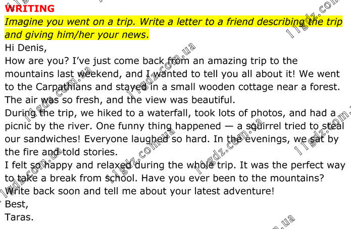 WRITING Imagine you went on a trip. Write a letter to a friend describing the trip and giving him/her your news. Hi Denis, How are you? I’ve just come back from an amazing trip to the mountains last weekend, and I wanted to tell you all about it! We went to the Carpathians and stayed in a small wooden cottage near a forest. The air was so fresh, and the view was beautiful. During the trip, we hiked to a waterfall, took lots of photos, and had a picnic by the river. One funny thing happened — a squirrel tried to steal our sandwiches! Everyone laughed so hard. In the evenings, we sat by the fire and told stories. I felt so happy and relaxed during the whole trip. It was the perfect way to take a break from school. Have you ever been to the mountains? Write back soon and tell me about your latest adventure! Best, Taras.