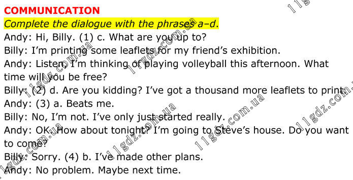 COMMUNICATION Complete the dialogue with the phrases a–d. Andy: Hi, Billy. (1) c. What are you up to? Billy: I’m printing some leaflets for my friend’s exhibition. Andy: Listen, I’m thinking of playing volleyball this afternoon. What time will you be free? Billy: (2) d. Are you kidding? I’ve got a thousand more leaflets to print. Andy: (3) a. Beats me. Billy: No, I’m not. I’ve only just started really. Andy: OK. How about tonight? I’m going to Steve’s house. Do you want to come? Billy: Sorry. (4) b. I’ve made other plans. Andy: No problem. Maybe next time.