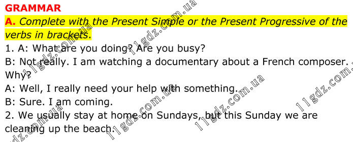 GRAMMAR A. Complete with the Present Simple or the Present Progressive of the verbs in brackets. 1. A: What are you doing? Are you busy? B: Not really. I am watching a documentary about a French composer. Why? A: Well, I really need your help with something. B: Sure. I am coming. 2. We usually stay at home on Sundays, but this Sunday we are cleaning up the beach.