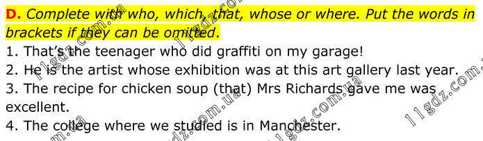 D. Complete with who, which, that, whose or where. Put the words in brackets if they can be omitted. 1. That’s the teenager who did graffiti on my garage! 2. He is the artist whose exhibition was at this art gallery last year. 3. The recipe for chicken soup (that) Mrs Richards gave me was excellent. 4. The college where we studied is in Manchester.