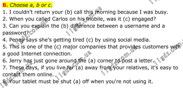 B. Choose a, b or c. 1. I couldn't return your (b) call this morning because I was busy. 2. When you called Carlos on his mobile, was it (c) engaged? 3. Can you explain the (b) difference between a username and a password? 4. Penny says she's getting tired (c) by using social media. 5. This is one of the (c) major companies that provides customers with a good Internet connection. 6. Jerry has just gone around the (a) corner to post a letter. 7. These days, if you live far (a) away from your relatives, it's easy to contact them online. 8. Your tablet must be shut (a) off when you're not using it.