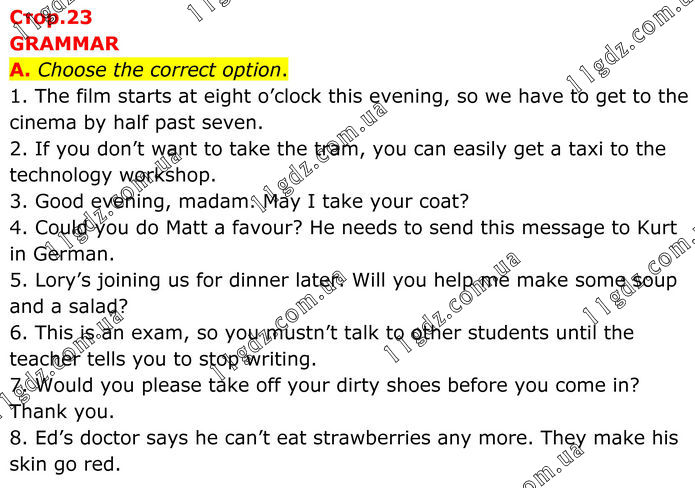 GRAMMAR A. Choose the correct option. 1. The film starts at eight o’clock this evening, so we have to get to the cinema by half past seven. 2. If you don’t want to take the tram, you can easily get a taxi to the technology workshop. 3. Good evening, madam. May I take your coat? 4. Could you do Matt a favour? He needs to send this message to Kurt in German. 5. Lory’s joining us for dinner later. Will you help me make some soup and a salad? 6. This is an exam, so you mustn’t talk to other students until the teacher tells you to stop writing. 7. Would you please take off your dirty shoes before you come in? Thank you. 8. Ed’s doctor says he can’t eat strawberries any more. They make his skin go red.