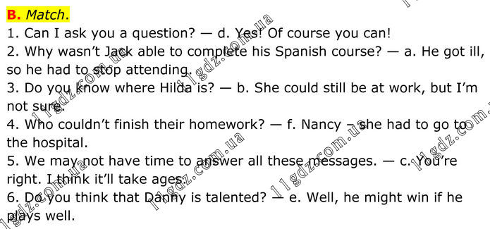 B. Match. 1. Can I ask you a question? — d. Yes! Of course you can! 2. Why wasn’t Jack able to complete his Spanish course? — a. He got ill, so he had to stop attending. 3. Do you know where Hilda is? — b. She could still be at work, but I’m not sure. 4. Who couldn’t finish their homework? — f. Nancy – she had to go to the hospital. 5. We may not have time to answer all these messages. — c. You’re right. I think it’ll take ages. 6. Do you think that Danny is talented? — e. Well, he might win if he plays well.