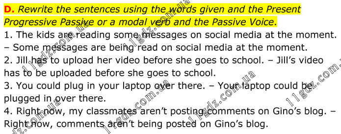 D. Rewrite the sentences using the words given and the Present Progressive Passive or a modal verb and the Passive Voice. 1. The kids are reading some messages on social media at the moment. – Some messages are being read on social media at the moment. 2. Jill has to upload her video before she goes to school. – Jill’s video has to be uploaded before she goes to school. 3. You could plug in your laptop over there. – Your laptop could be plugged in over there. 4. Right now, my classmates aren’t posting comments on Gino’s blog. – Right now, comments aren’t being posted on Gino’s blog.