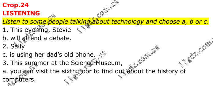 LISTENING Listen to some people talking about technology and choose a, b or c. 1. This evening, Stevie b. will attend a debate. 2. Sally c. is using her dad’s old phone. 3. This summer at the Science Museum, a. you can visit the sixth floor to find out about the history of computers.