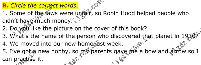 B. Circle the correct words. 1. Some of the laws were unfair, so Robin Hood helped people who didn’t have much money. 2. Do you like the picture on the cover of this book? 3. What’s the name of the person who discovered that planet in 1930? 4. We moved into our new home last week. 5. I’ve got a new hobby, so my parents gave me a bow and arrow so I can practise it.