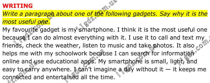 WRITING Write a paragraph about one of the following gadgets. Say why it is the most useful one. My favourite gadget is my smartphone. I think it is the most useful one because I can do almost everything with it. I use it to call and text my friends, check the weather, listen to music and take photos. It also helps me with my schoolwork because I can search for information online and use educational apps. My smartphone is small, light, and easy to carry anywhere. I can’t imagine a day without it — it keeps me connected and entertained all the time.