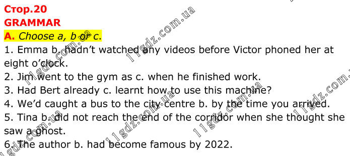 GRAMMAR A. Choose a, b or c. 1. Emma b. hadn’t watched any videos before Victor phoned her at eight o’clock. 2. Jim went to the gym as c. when he finished work. 3. Had Bert already c. learnt how to use this machine? 4. We’d caught a bus to the city centre b. by the time you arrived. 5. Tina b. did not reach the end of the corridor when she thought she saw a ghost. 6. The author b. had become famous by 2022.