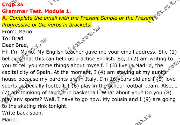 Grammar Test. Module 1. A. Complete the email with the Present Simple or the Present Progressive of the verbs in brackets. From: Mario To: Brad Dear Brad, Hi! I’m Mario. My English teacher gave me your email address. She (1) believes that this can help us practise English. So, I (2) am writing to you to tell you some things about myself. I (3) live in Madrid, the capital city of Spain. At the moment, I (4) am staying at my aunt’s house because my parents are in Italy. I’m 16 years old and I (5) love sports, especially football. I (6) play in the school football team. Also, I (7) am thinking of taking up basketball. What about you? Do you (8) play any sports? Well, I have to go now. My cousin and I (9) are going to the skating rink tonight. Write back soon, Mario.