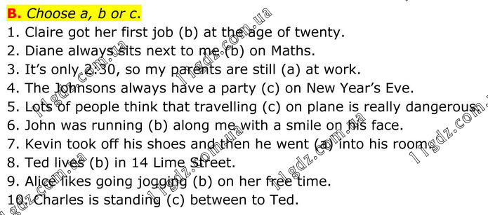 B. Choose a, b or c. 1. Claire got her first job (b) at the age of twenty. 2. Diane always sits next to me (b) on Maths. 3. It’s only 2:30, so my parents are still (a) at work. 4. The Johnsons always have a party (c) on New Year’s Eve. 5. Lots of people think that travelling (c) on plane is really dangerous. 6. John was running (b) along me with a smile on his face. 7. Kevin took off his shoes and then he went (a) into his room. 8. Ted lives (b) in 14 Lime Street. 9. Alice likes going jogging (b) on her free time. 10. Charles is standing (c) between to Ted.