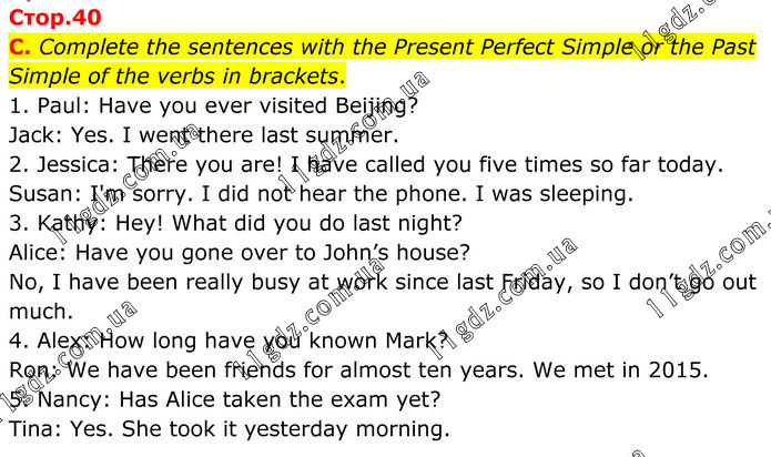 C. Complete the sentences with the Present Perfect Simple or the Past Simple of the verbs in brackets. 1. Paul: Have you ever visited Beijing? Jack: Yes. I went there last summer. 2. Jessica: There you are! I have called you five times so far today. Susan: I'm sorry. I did not hear the phone. I was sleeping. 3. Kathy: Hey! What did you do last night? Alice: Have you gone over to John’s house? No, I have been really busy at work since last Friday, so I don’t go out much. 4. Alex: How long have you known Mark? Ron: We have been friends for almost ten years. We met in 2015. 5. Nancy: Has Alice taken the exam yet? Tina: Yes. She took it yesterday morning.