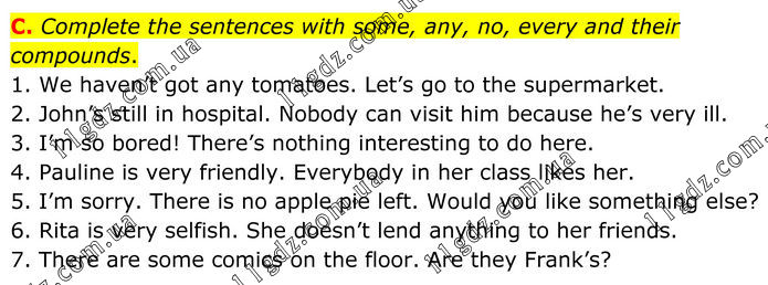 C. Complete the sentences with some, any, no, every and their compounds. 1. We haven’t got any tomatoes. Let’s go to the supermarket. 2. John’s still in hospital. Nobody can visit him because he’s very ill. 3. I’m so bored! There’s nothing interesting to do here. 4. Pauline is very friendly. Everybody in her class likes her. 5. I’m sorry. There is no apple pie left. Would you like something else? 6. Rita is very selfish. She doesn’t lend anything to her friends. 7. There are some comics on the floor. Are they Frank’s?