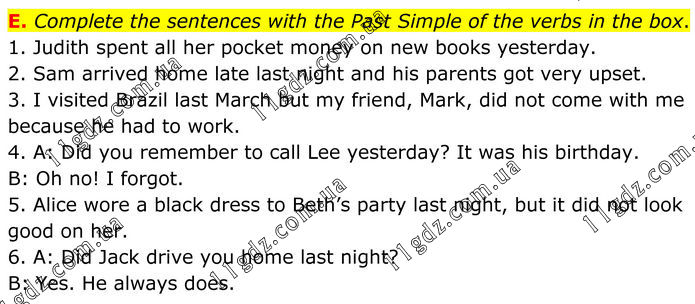 E. Complete the sentences with the Past Simple of the verbs in the box. 1. Judith spent all her pocket money on new books yesterday. 2. Sam arrived home late last night and his parents got very upset. 3. I visited Brazil last March but my friend, Mark, did not come with me because he had to work. 4. A: Did you remember to call Lee yesterday? It was his birthday. B: Oh no! I forgot. 5. Alice wore a black dress to Beth’s party last night, but it did not look good on her. 6. A: Did Jack drive you home last night? B: Yes. He always does.