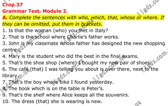 Grammar Test. Module 2. A. Complete the sentences with who, which, that, whose or where. If they can be omitted, put them in brackets. 1. Is that the woman (who) you met in Italy? 2. That is the school where Charlie’s father works. 3. John is my classmate whose father has designed the new shopping centre. 4. Mary is the student who did the best in the final exams. 5. That’s the shoe shop (where) I bought my new pair of shoes. 6. The café (that) I was telling you about is over there, next to the library. 7. That’s the boy whose bike I found yesterday. 8. The book which is on the table is Peter’s. 9. That’s the shelf where Alice keeps all the souvenirs. 10. The dress (that) she is wearing is new.