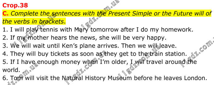 C. Complete the sentences with the Present Simple or the Future will of the verbs in brackets. 1. I will play tennis with Mary tomorrow after I do my homework. 2. If my mother hears the news, she will be very happy. 3. We will wait until Ken’s plane arrives. Then we will leave. 4. They will buy tickets as soon as they get to the train station. 5. If I have enough money when I’m older, I will travel around the world. 6. Tom will visit the Natural History Museum before he leaves London.