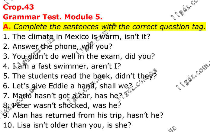 Grammar Test. Module 5. A. Complete the sentences with the correct question tag. 1. The climate in Mexico is warm, isn’t it? 2. Answer the phone, will you? 3. You didn’t do well in the exam, did you? 4. I am a fast swimmer, aren’t I? 5. The students read the book, didn’t they? 6. Let’s give Eddie a hand, shall we? 7. Mario hasn’t got a car, has he? 8. Peter wasn’t shocked, was he? 9. Alan has returned from his trip, hasn’t he? 10. Lisa isn’t older than you, is she?