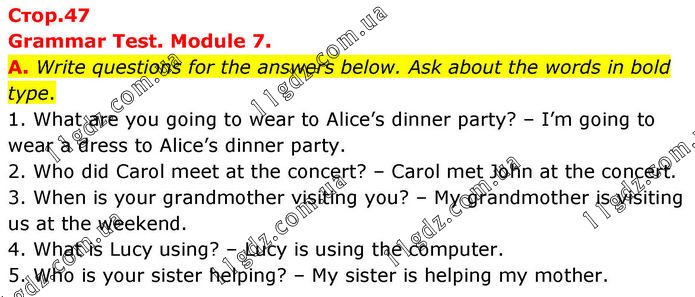 Grammar Test. Module 7. A. Write questions for the answers below. Ask about the words in bold type. 1. What are you going to wear to Alice’s dinner party? – I’m going to wear a dress to Alice’s dinner party. 2. Who did Carol meet at the concert? – Carol met John at the concert. 3. When is your grandmother visiting you? – My grandmother is visiting us at the weekend. 4. What is Lucy using? – Lucy is using the computer. 5. Who is your sister helping? – My sister is helping my mother.