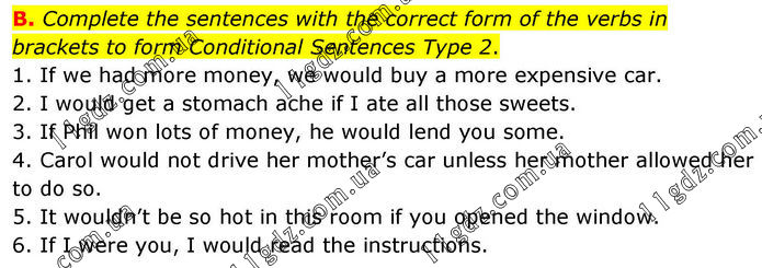 B. Complete the sentences with the correct form of the verbs in brackets to form Conditional Sentences Type 2. 1. If we had more money, we would buy a more expensive car. 2. I would get a stomach ache if I ate all those sweets. 3. If Phil won lots of money, he would lend you some. 4. Carol would not drive her mother’s car unless her mother allowed her to do so. 5. It wouldn’t be so hot in this room if you opened the window. 6. If I were you, I would read the instructions.