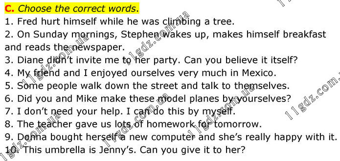 C. Choose the correct words. 1. Fred hurt himself while he was climbing a tree. 2. On Sunday mornings, Stephen wakes up, makes himself breakfast and reads the newspaper. 3. Diane didn’t invite me to her party. Can you believe it itself? 4. My friend and I enjoyed ourselves very much in Mexico. 5. Some people walk down the street and talk to themselves. 6. Did you and Mike make these model planes by yourselves? 7. I don’t need your help. I can do this by myself. 8. The teacher gave us lots of homework for tomorrow. 9. Donna bought herself a new computer and she’s really happy with it. 10. This umbrella is Jenny’s. Can you give it to her?
