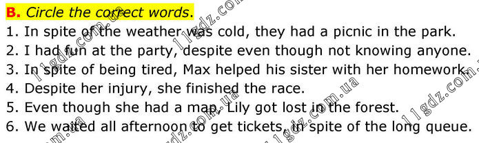 B. Circle the correct words. 1. In spite of the weather was cold, they had a picnic in the park. 2. I had fun at the party, despite even though not knowing anyone. 3. In spite of being tired, Max helped his sister with her homework. 4. Despite her injury, she finished the race. 5. Even though she had a map, Lily got lost in the forest. 6. We waited all afternoon to get tickets, in spite of the long queue.