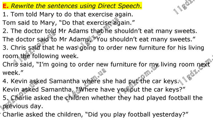 E. Rewrite the sentences using Direct Speech. 1. Tom told Mary to do that exercise again. Tom said to Mary, “Do that exercise again.” 2. The doctor told Mr Adams that he shouldn’t eat many sweets. The doctor said to Mr Adams, “You shouldn’t eat many sweets.” 3. Chris said that he was going to order new furniture for his living room the following week. Chris said, “I’m going to order new furniture for my living room next week.” 4. Kevin asked Samantha where she had put the car keys. Kevin asked Samantha, “Where have you put the car keys?” 5. Charlie asked the children whether they had played football the previous day. Charlie asked the children, “Did you play football yesterday?”