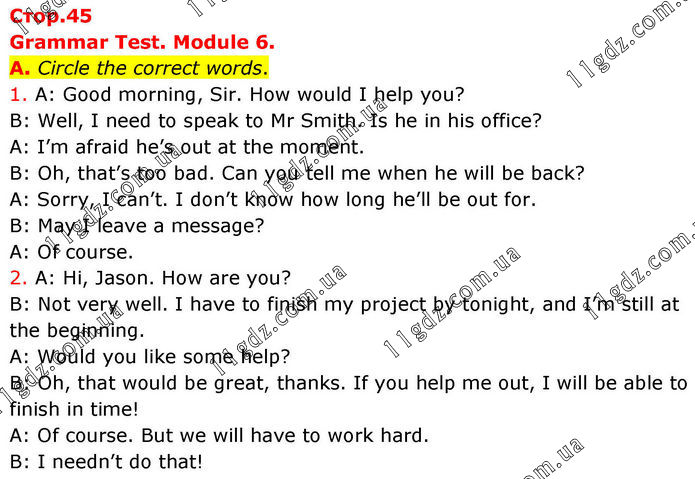 Grammar Test. Module 6. A. Circle the correct words. 1. A: Good morning, Sir. How would I help you? B: Well, I need to speak to Mr Smith. Is he in his office? A: I’m afraid he’s out at the moment. B: Oh, that’s too bad. Can you tell me when he will be back? A: Sorry, I can’t. I don’t know how long he’ll be out for. B: May I leave a message? A: Of course. 2. A: Hi, Jason. How are you? B: Not very well. I have to finish my project by tonight, and I’m still at the beginning. A: Would you like some help? B: Oh, that would be great, thanks. If you help me out, I will be able to finish in time! A: Of course. But we will have to work hard. B: I needn’t do that!