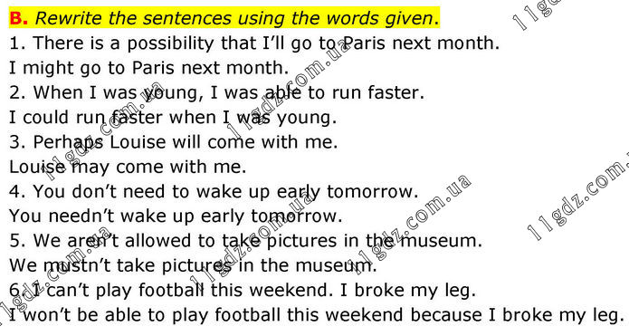 B. Rewrite the sentences using the words given. 1. There is a possibility that I’ll go to Paris next month. I might go to Paris next month. 2. When I was young, I was able to run faster. I could run faster when I was young. 3. Perhaps Louise will come with me. Louise may come with me. 4. You don’t need to wake up early tomorrow. You needn’t wake up early tomorrow. 5. We aren’t allowed to take pictures in the museum. We mustn’t take pictures in the museum. 6. I can’t play football this weekend. I broke my leg. I won’t be able to play football this weekend because I broke my leg.