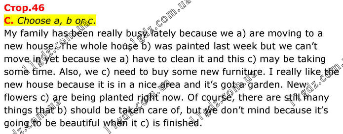 C. Choose a, b or c. My family has been really busy lately because we a) are moving to a new house. The whole house b) was painted last week but we can’t move in yet because we a) have to clean it and this c) may be taking some time. Also, we c) need to buy some new furniture. I really like the new house because it is in a nice area and it’s got a garden. New flowers c) are being planted right now. Of course, there are still many things that b) should be taken care of, but we don’t mind because it’s going to be beautiful when it c) is finished.