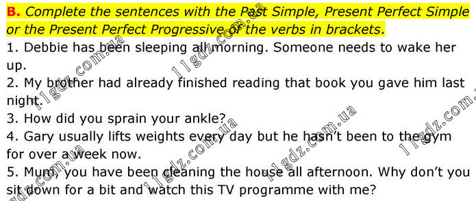 B. Complete the sentences with the Past Simple, Present Perfect Simple or the Present Perfect Progressive of the verbs in brackets. 1. Debbie has been sleeping all morning. Someone needs to wake her up. 2. My brother had already finished reading that book you gave him last night. 3. How did you sprain your ankle? 4. Gary usually lifts weights every day but he hasn’t been to the gym for over a week now. 5. Mum, you have been cleaning the house all afternoon. Why don’t you sit down for a bit and watch this TV programme with me?