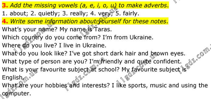 3. Add the missing vowels (a, e, i, o, u) to make adverbs. 1. about; 2. quietly; 3. really; 4. very; 5. fairly. 4. Write some information about yourself for these notes. What’s your name? My name is Taras. Which country do you come from? I’m from Ukraine. Where do you live? I live in Ukraine. What do you look like? I’ve got short dark hair and brown eyes. What type of person are you? I’m friendly and quite confident. What is your favourite subject at school? My favourite subject is English. What are your hobbies and interests? I like sports, music and using the computer.